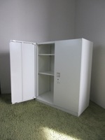 この保管庫は、優れた耐久性と機能性を兼ね備えています。シンプルな両開きの扉は、アクセスがしやすく、収納物を一目で確認できるのが大きな魅力です。また、内部には十分なスペースが確保されており、書類や小物、そして重要なファイルを安全に保管できます。