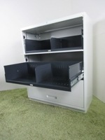 また、下記写真の通り、扉が上に開く構造となっているため、扉を開けるだけで中の書類が何かすぐに分かります!また、棚が前に出すことも可能なので、両開き保管庫とラテラル保管庫両方のいいところを両方兼ね揃えた商品となっています。